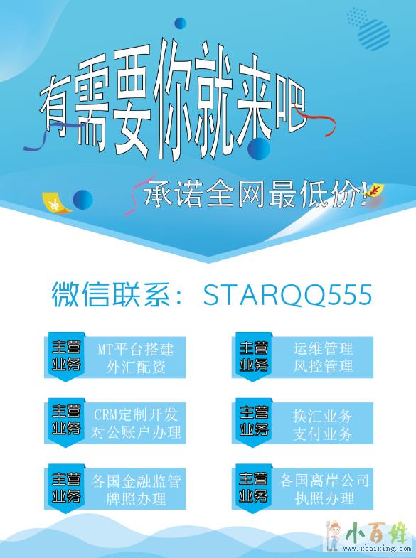 主营业务:MT平台搭建,各国金融监管牌照办理,外汇配资,运维管理,风控管理,CRM定制开发,各国离岸公司执照办理,对公账户办理,换汇业务,支付业务 有需要你就来吧 承诺全网最低价! 小+百+姓+网