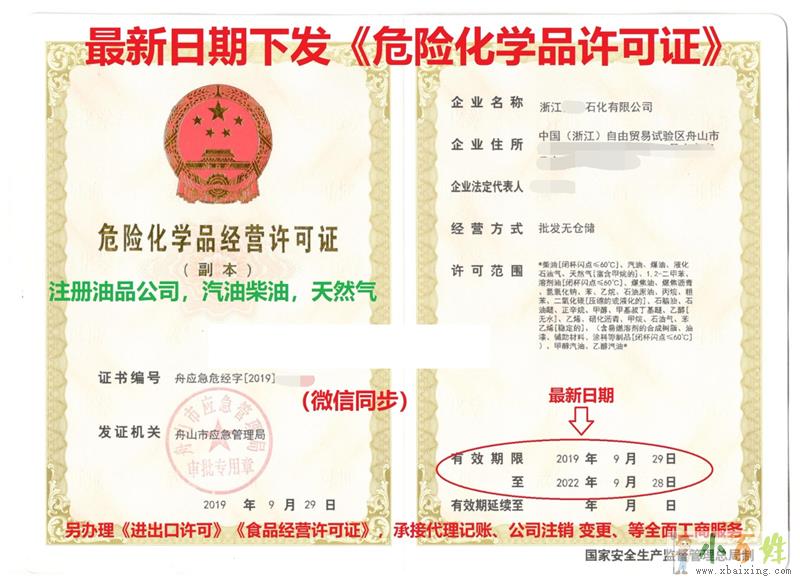 一、 舟山办理油品公司,可异地经营,提供地址,价格优惠,我们在营业执照和《危化证》里面给予汽油、柴油、等等两千多危险品的经营范围,您可以做批发,浙江舟山办理油品公司